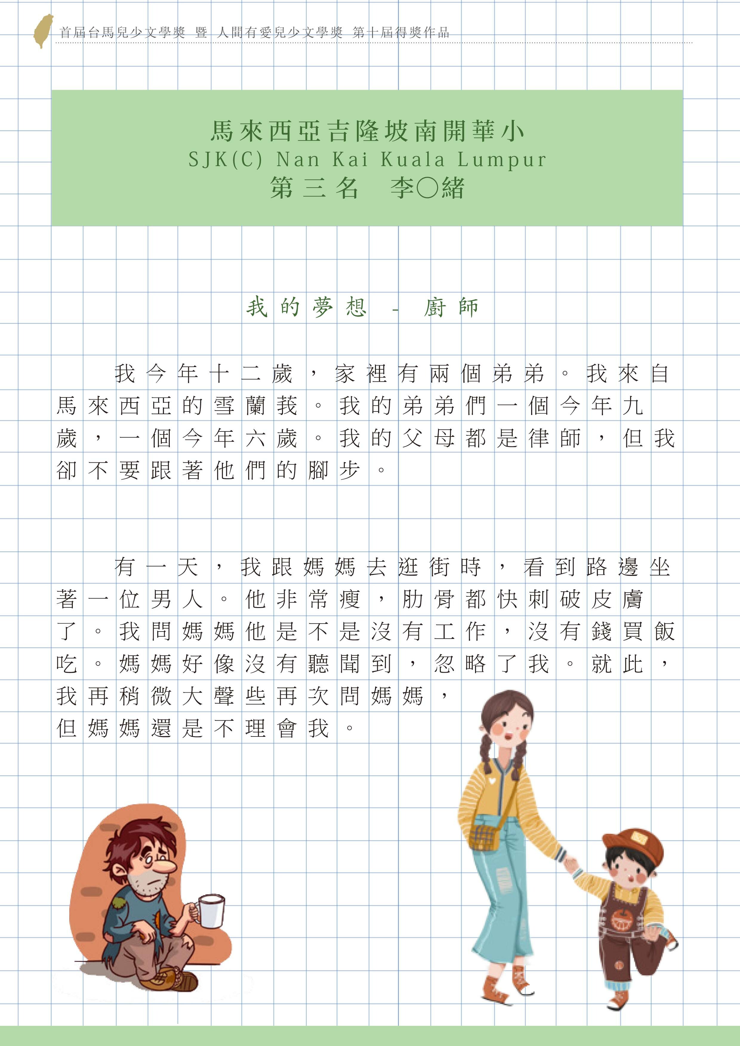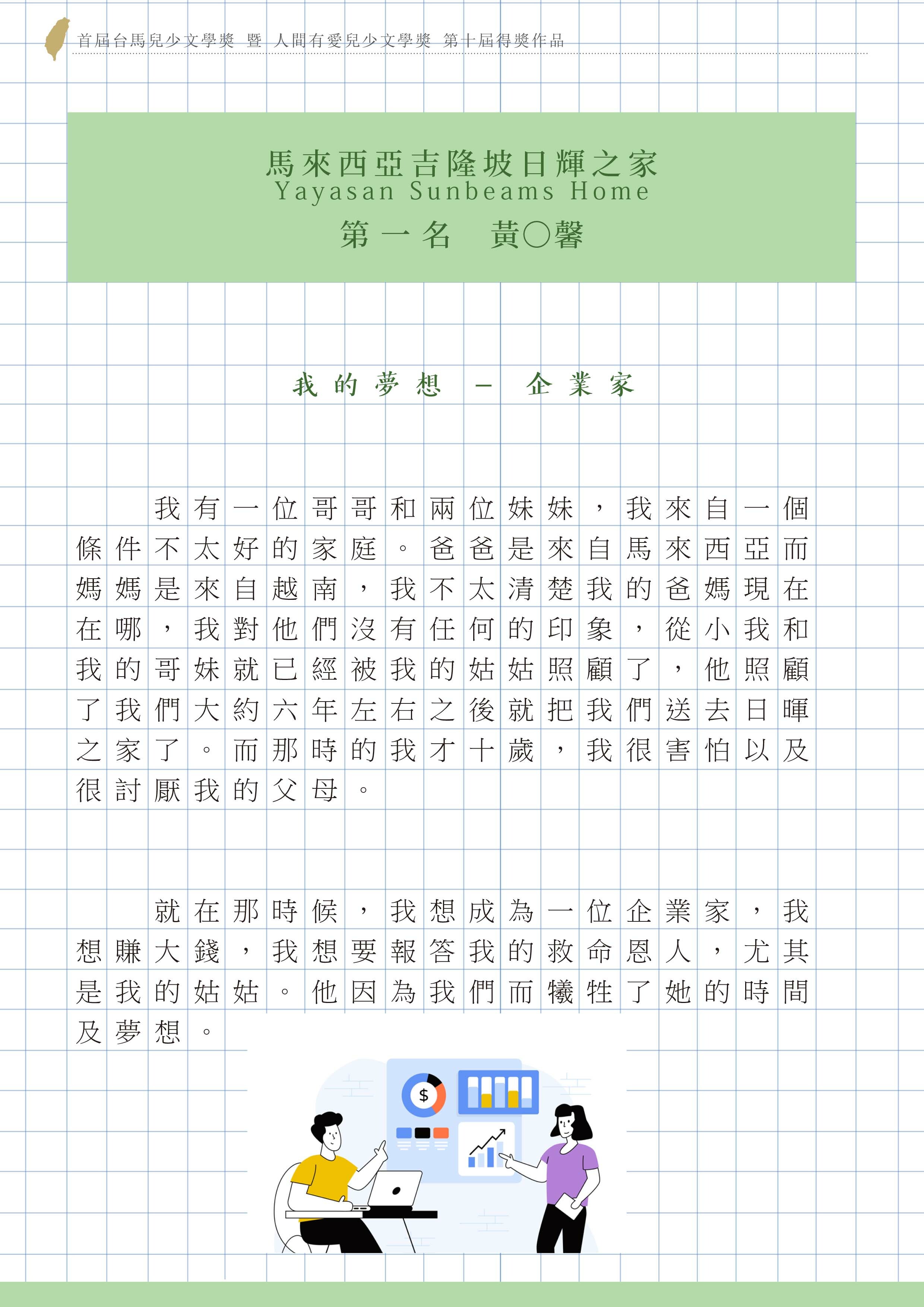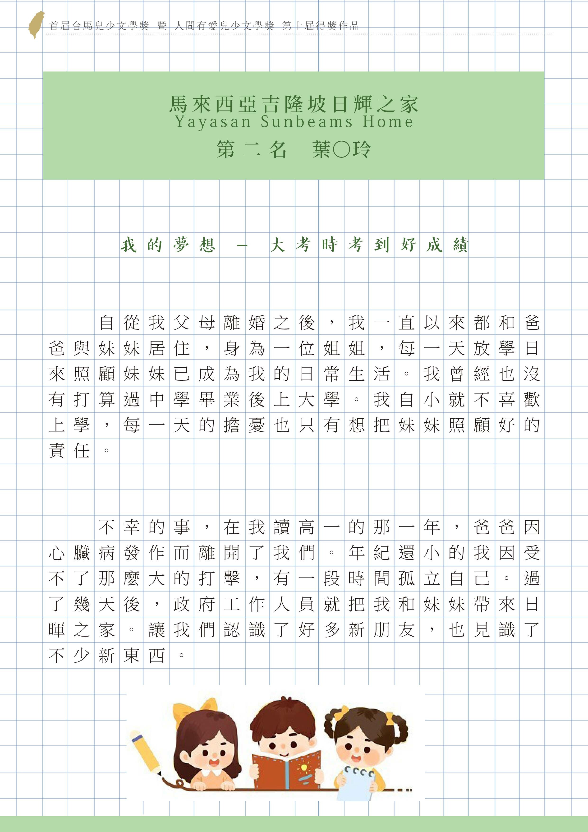 兒少文學獎以「我的夢想」為創作主題,對象為特殊境遇的孩子,透過創作分享自己心中的夢想,同時,讓他們的夢想被看見、被實現~經評審委員嚴謹的初、複、決審後選出優異作品,看見孩子上台領獎的榮耀感,是他們人生中的第一次被肯定!