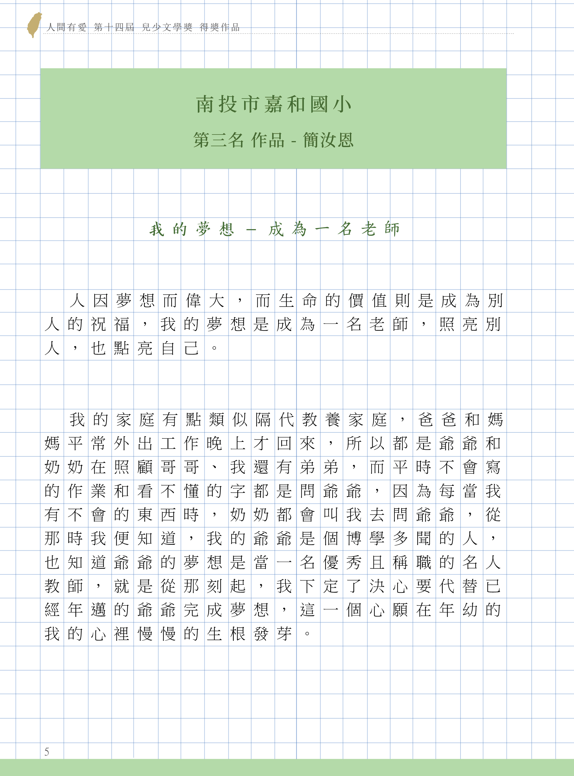 兒少文學獎以「我的夢想」為創作主題,對象為特殊境遇的孩子,透過創作分享自己心中的夢想,同時,讓他們的夢想被看見、被實現~經評審委員嚴謹的初、複、決審後選出優異作品,看見孩子上台領獎的榮耀感,是他們人生中的第一次被肯定!
