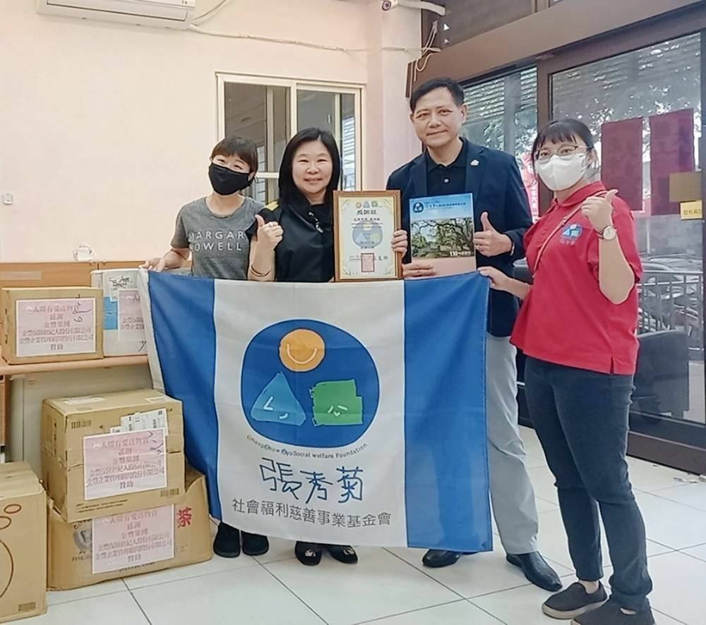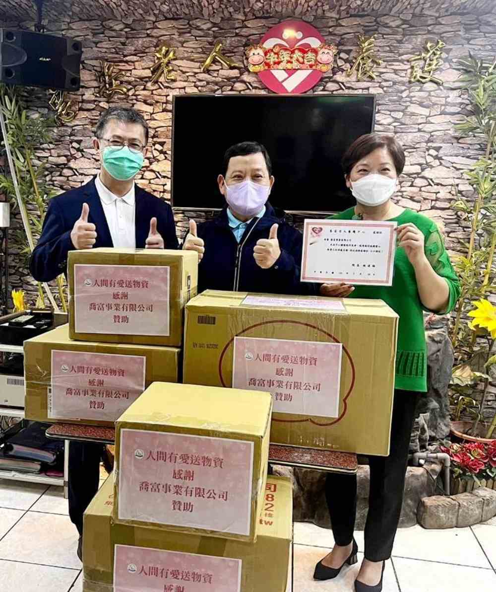喬富事業總經理張駿鵬、賢伉儷董秀櫻,長期推動生命服務,讓社會基層的每個人及每個家庭深確了解生命規劃的重要性,此次親自送物資給老人養護中心。