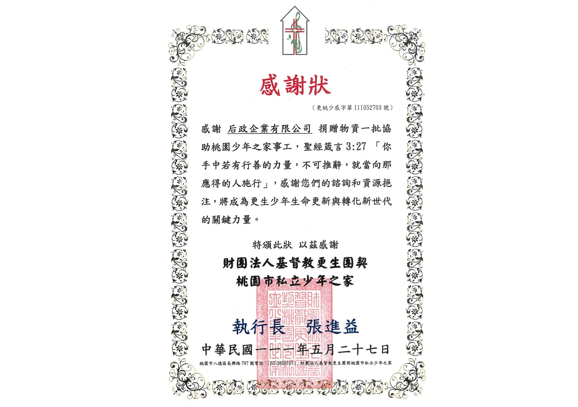 贊助:【人間有愛送物資】桃園市私立少年之家