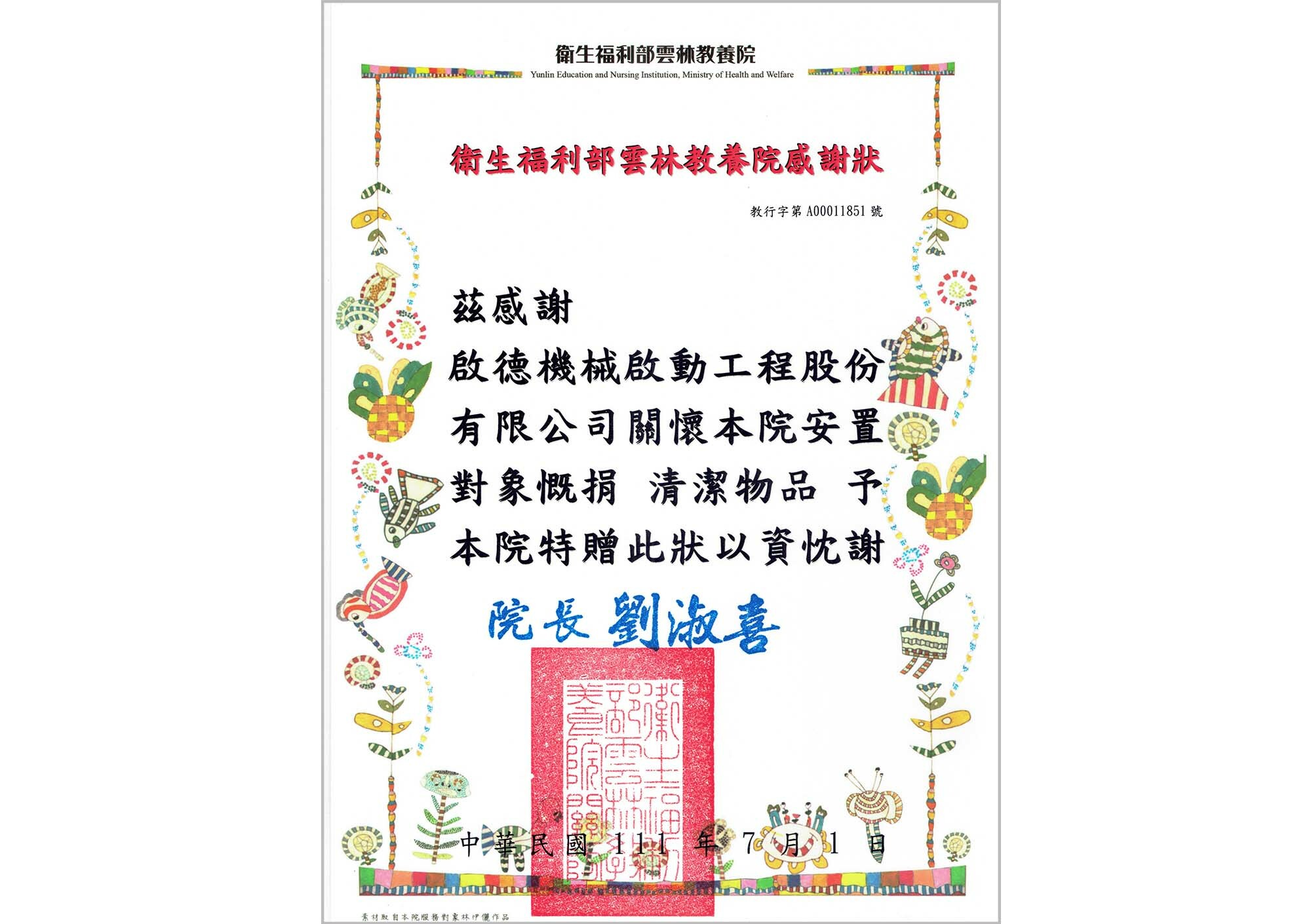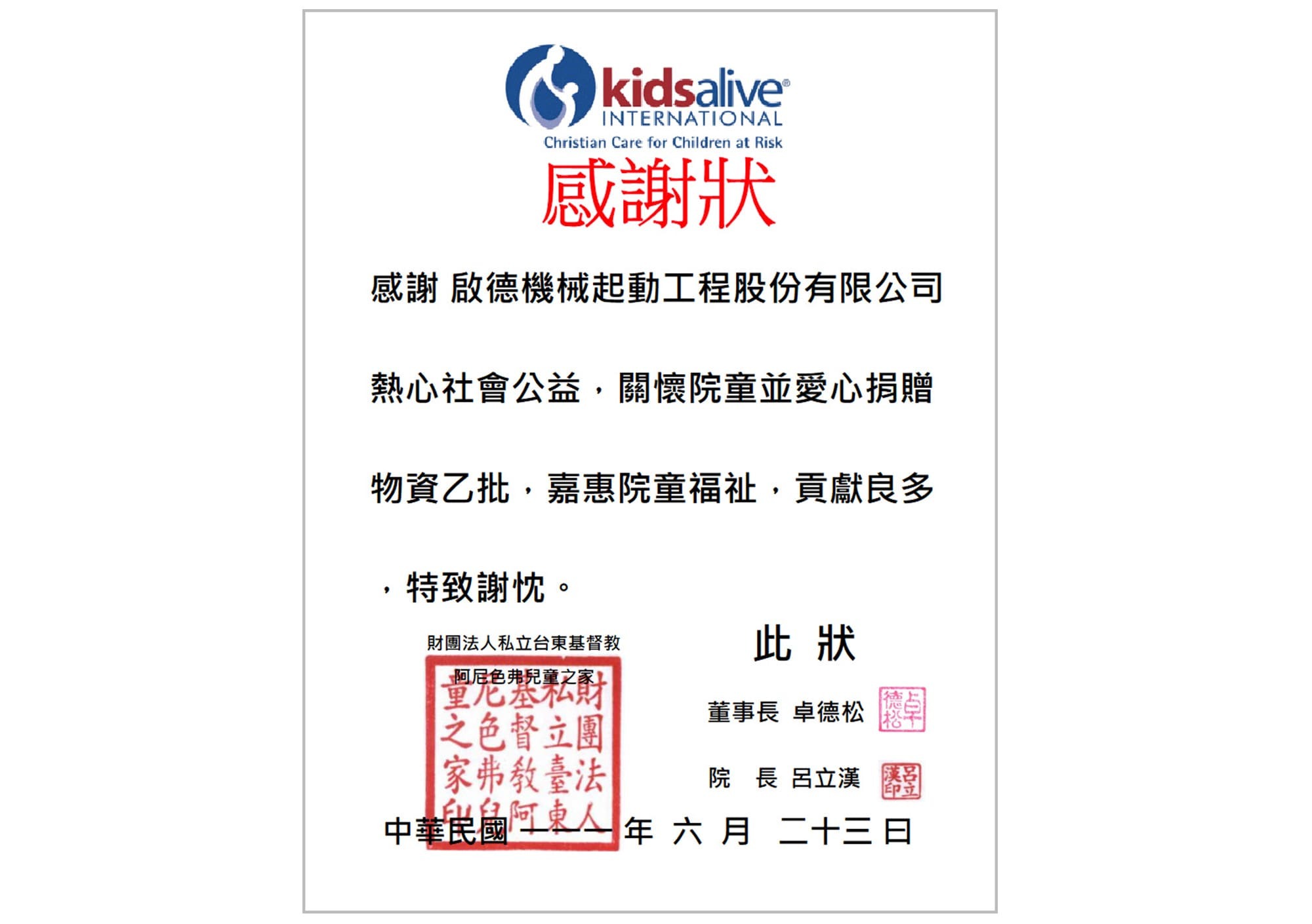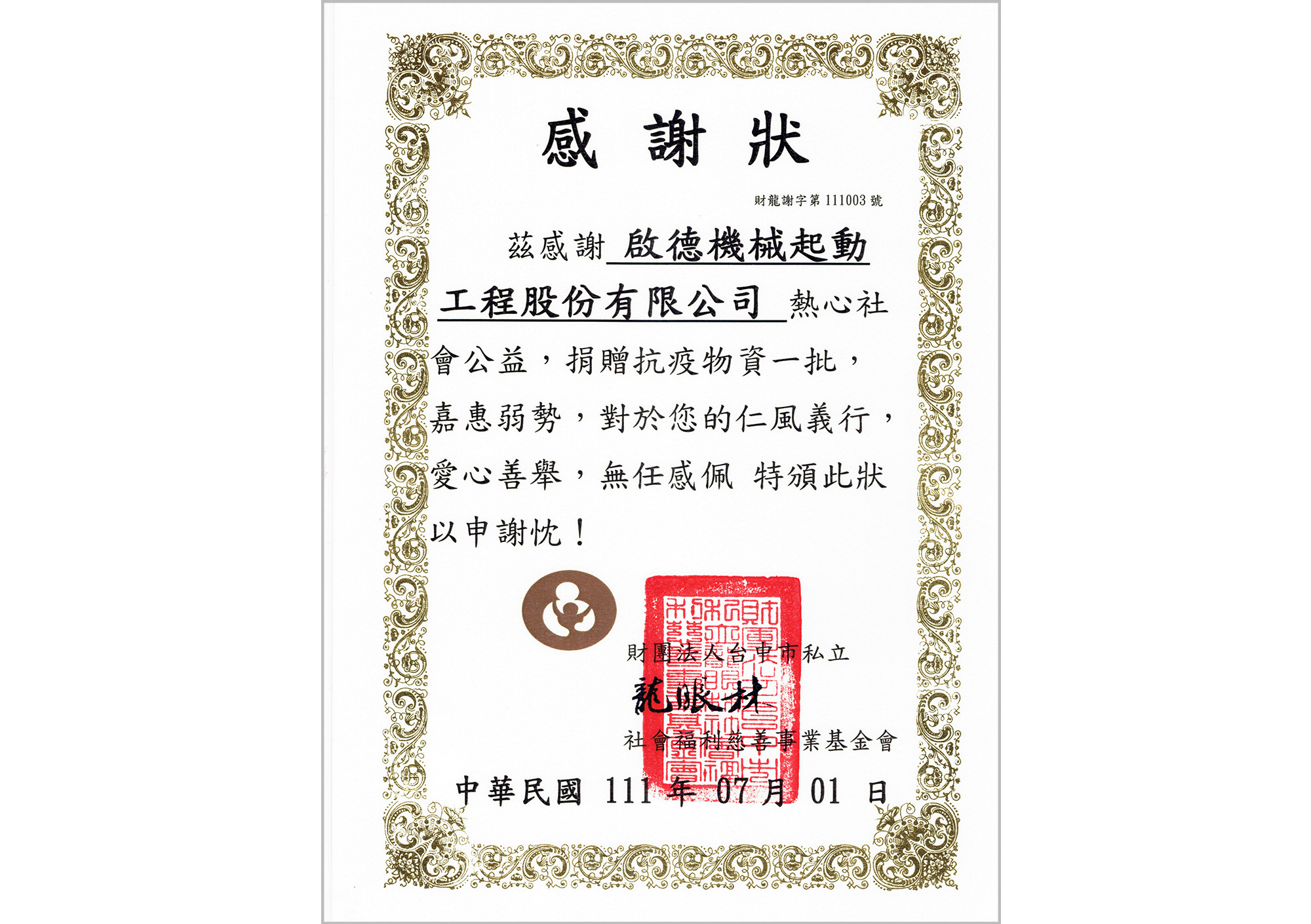 啟德機械起動工程股份有限公司也是一家愛心企業,長期出錢出力的捐助參與公益活動,讓公益團體及社會大眾都能受到協助,許多事蹟如挺醫護、交通事故救援,無私奉獻回饋社會,熱心公益執行救援工作,長期關懷心弱勢族群並捐贈救助金並長期關懷弱勢幫助弱勢民眾,讓大家都能暖心過個好年...等等事蹟,能與您同行做公益,真是溫暖滿人間。