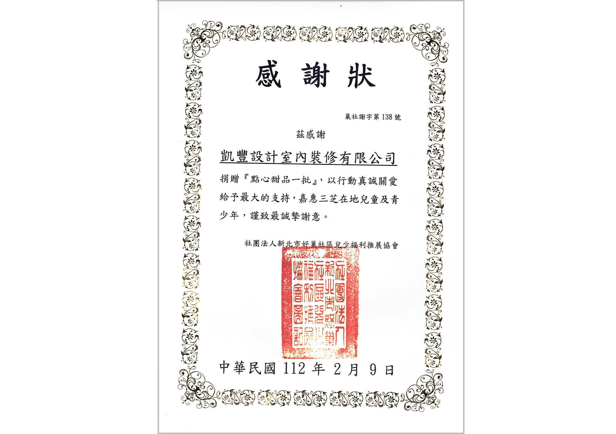 凱豐設計室內裝修有限公司 - 張凱帝總監,長期關懷兒童青少年,實際行動用愛心支持弱勢家庭,善盡社會責任,熱心參與公益,希望可以貢獻一份力量,為弱勢偏鄉兒童青少年創築出夢想的無限可能性,相信未來一定會更美好!