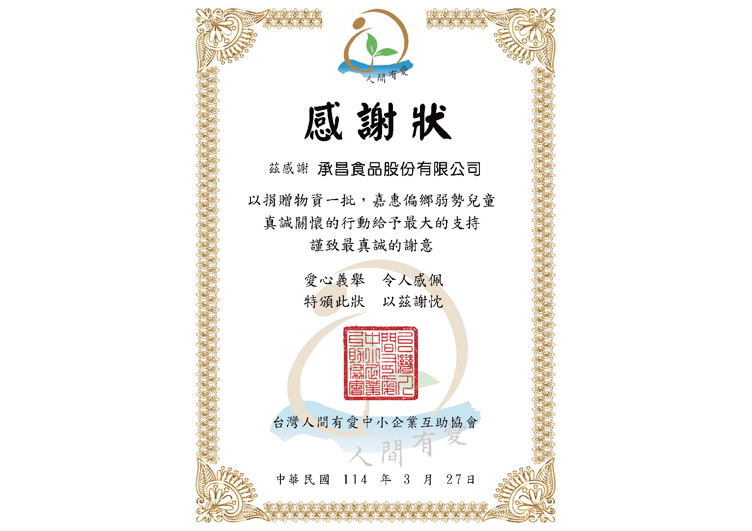 承昌致力於素食新口味的研發、不斷創新。從原料的嚴選到製程,無不盡心為消費者嚴格把關。產品涵蓋安全和健康意識,同時又不影響“方便”和“美味”,都是我們堅持的原則。期能以一滴水投入大海永不乾枯的精神,提供天然健康產品,帶給人類健康共創和樂社會。