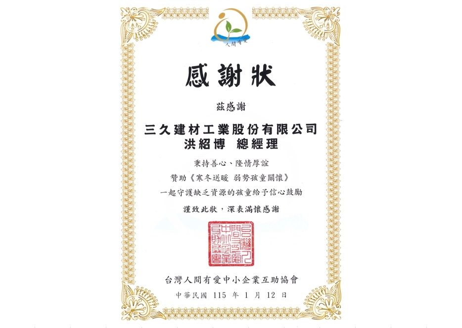將專業轉化為愛:用溫暖守護下一代 企業的價值在於社會關懷。三久建材長期攜手「人間有愛中小企業互助協會」,將守護家園的信念化作公益行動。無論是為偏鄉學童送上文具,或是關懷弱勢族群,我們期許這份力量能持續延伸,點亮孩子的夢想。未來,三久將持續以專業守護家庭、以愛心回饋社會,讓關懷在需要的角落靜靜發芽,成為溫暖社會的光芒。