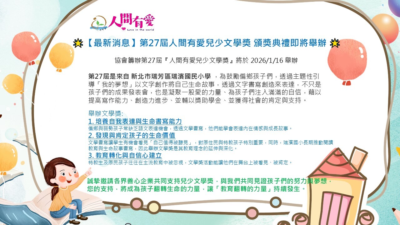 第27屆兒少文學獎 誠摯邀請企業支持共襄盛舉