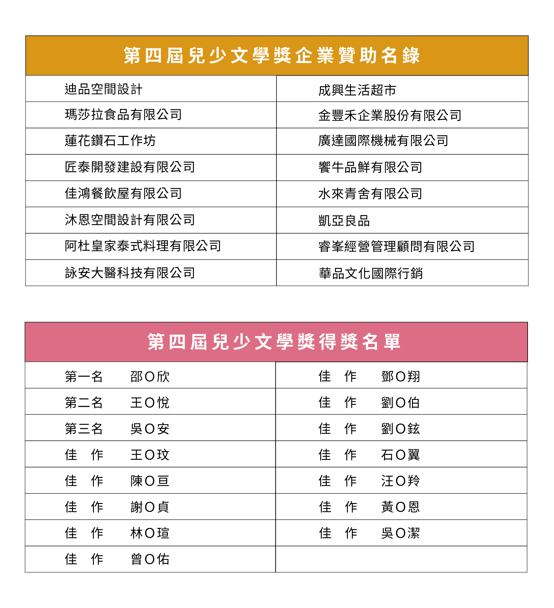 由台灣人間有愛中小企業互助協會發起的「人間有愛兒少文學獎」日前在台中上楓教會舉行頒奬活動,除了進行兒少寫作分享、喬克叔叔魔術表演,現場包括金豐禾企業、瑪莎拉手工餅舖、成興生活超市、匠泰開發建設、廣達國際機械、睿峯經營管理顧問、蓮花鑽石工作坊、沐恩空間設計、佳鴻餐飲屋、水來青舍等十多家暖心企業,在兒少的故事裡擔任圓夢大使,一同為兒少鼓勵並盡一份心力。