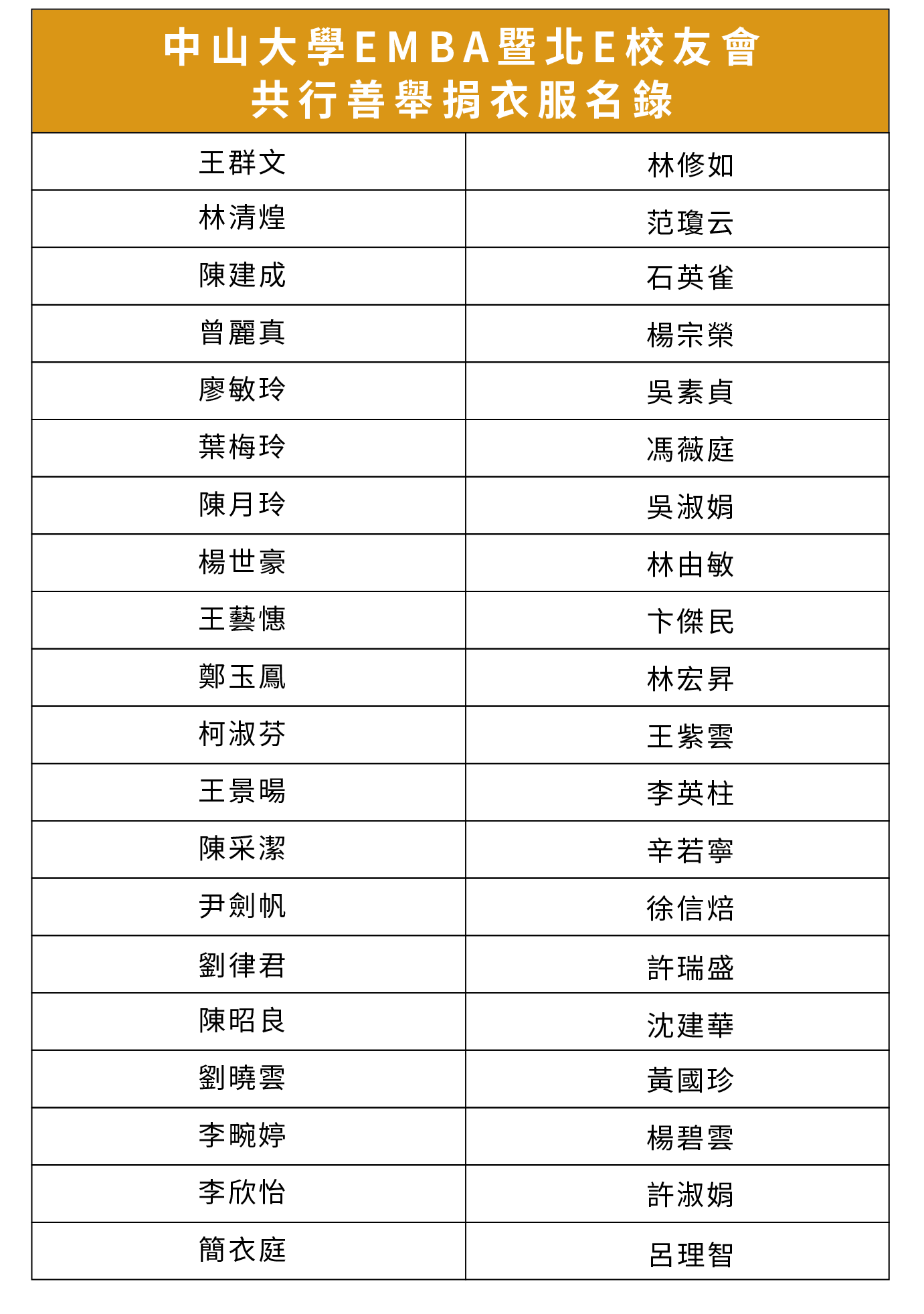 今年剛接任北E校友會理事長王群文與中山大學戈友會理事長林清煌,拋磚引玉參與捐衣活動一起做愛心,以資源扶助弱勢、獻愛不落人後。林清煌表示,在過往的人生行路上,承蒙一些師長及貴人的關愛,因此得以順遂,倒吃甘蔗。讀中山EMBA更是參與中山陽光基金會的關懷活動,深感人生歲月匆匆數十年,希望有我們善的行跡而世界更美好。