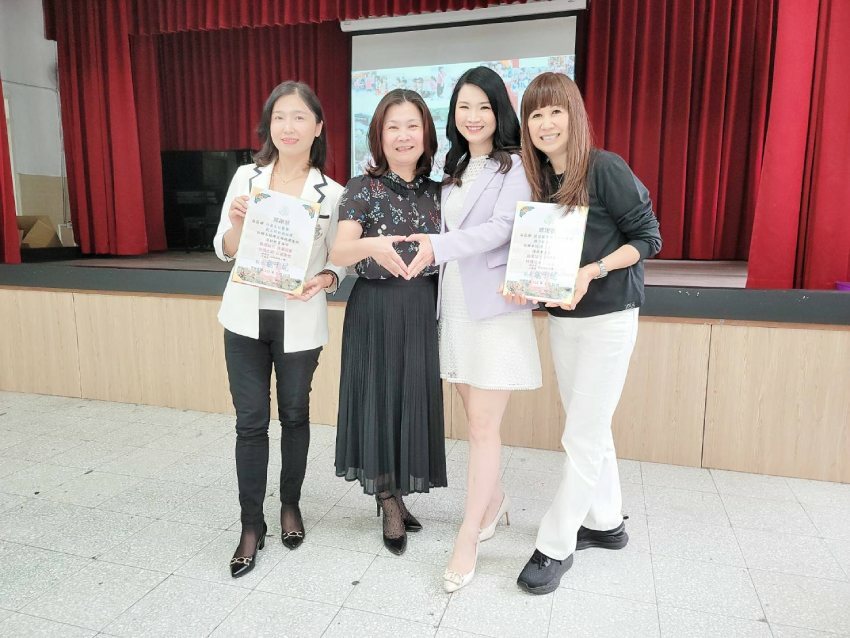 石碇國小校長(左2)親頒感謝狀給予林玉卿理事長(右2)表達謝意。