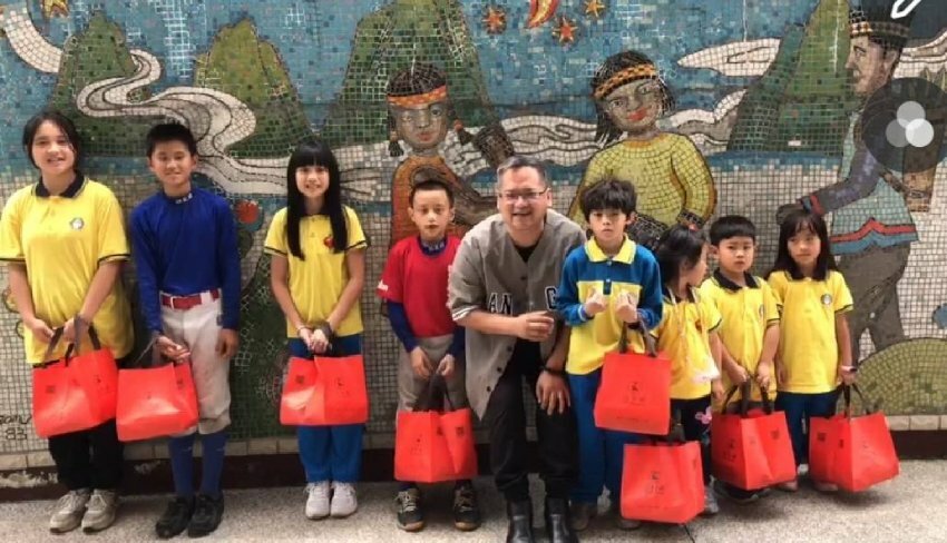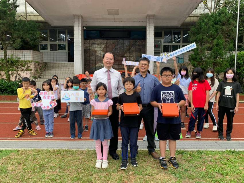 中山EMBA112陳貞臻親自前往十分國小送蛋糕,讓每一位領到蛋糕的孩童微笑歡欣。
