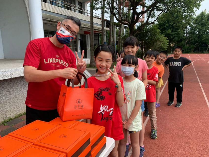 淡水興仁國小孩童開心領取母親節蛋糕。