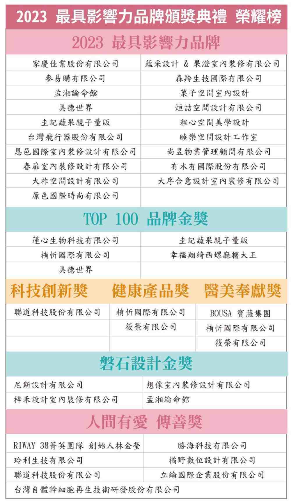 本屆獲獎的獎別分為「Top-100品牌金獎」、「科技創新獎」、「健康產品獎」、「醫美奉獻獎」及「磐石設計金獎」,期藉此引領各界推動台灣邁向創新經濟發展推動生活的改變,現場同時安排一場設計師商業論壇,邀請「有木有國際、程心空間美學、原色國際時尚」等從設計角度發展創新生活與體驗為主題,分享多媒體及線上線下帶來機會與挑戰,會場也設置了一個大型品牌簽名板,讓得獎企業簽名、記錄歷史一刻!