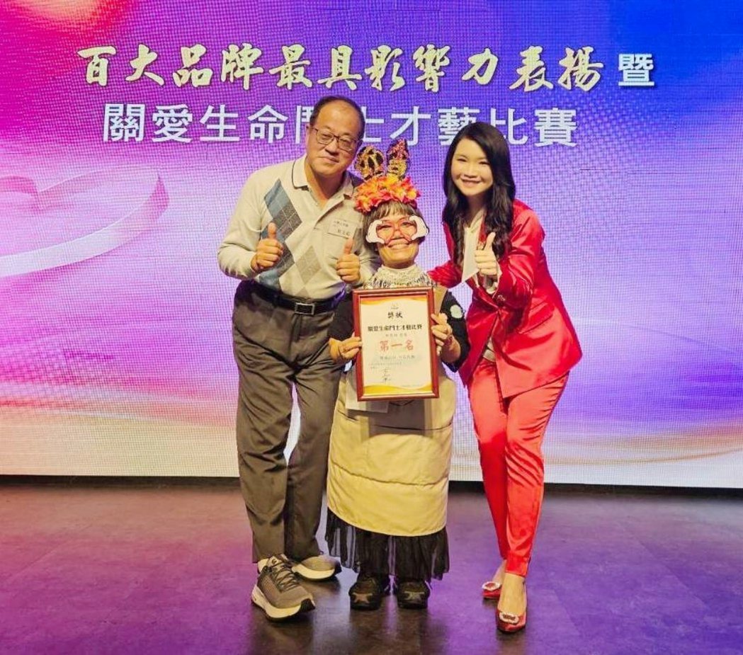 王子娘學府創辦人姚羽潞與台灣人間有愛中小企業互助協會理事長林玉卿,一同表揚生命鬥士動態獎第一名小巨人奶奶葉枝蓮。 業者/提供