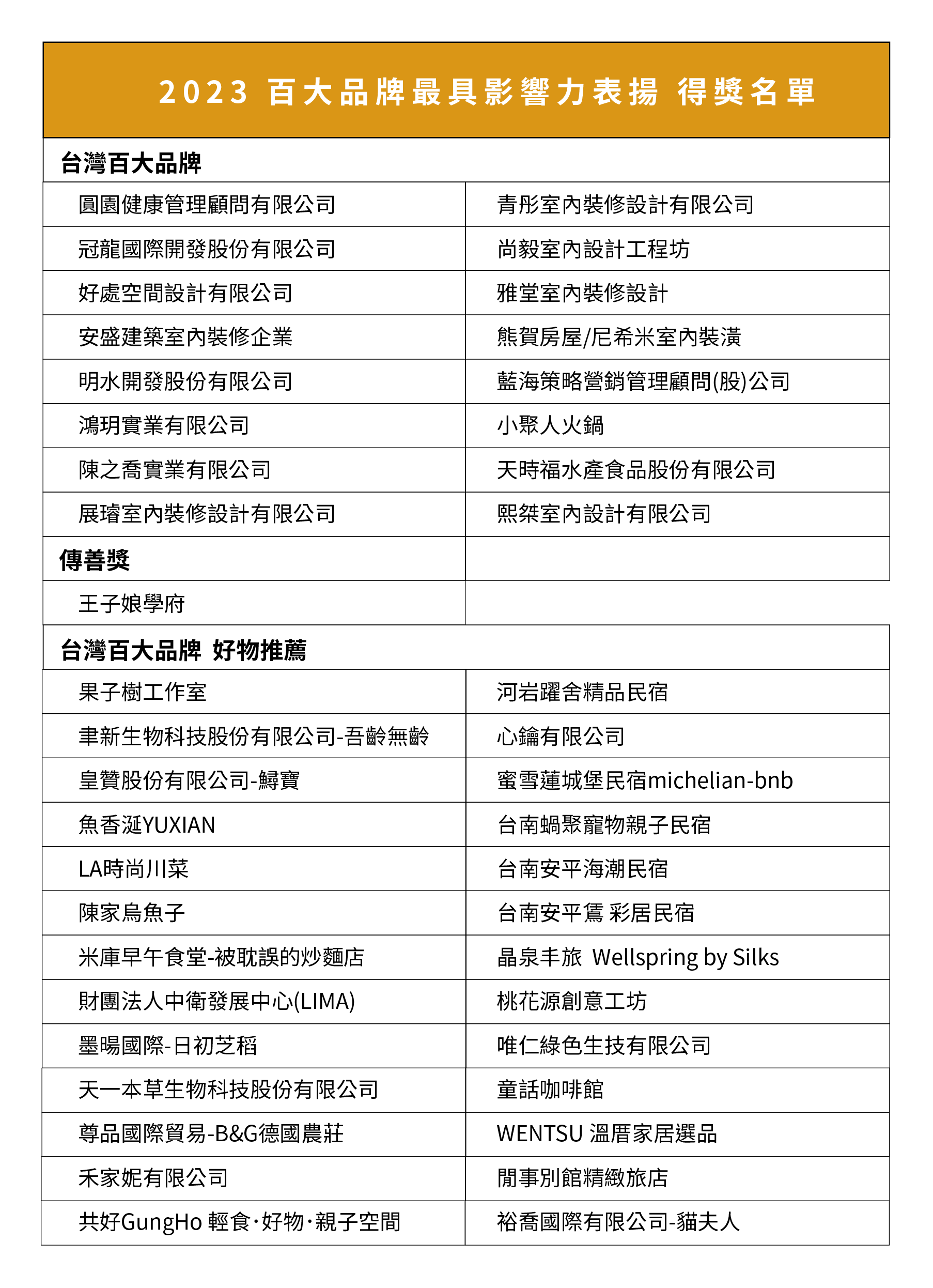 協會理事長林玉卿表示,台灣百大品牌的故事的平台能集結眾多產業於一堂,藉由企業家的故事與經驗,展現台灣人在自己專業領域精益求精的態度,並化作一股力量共同為產業及社會一起做努力,並特別邀請財團法人創新智庫暨企業大學基金會董事長王孝慈、前臺南縣長-現任台灣維新創黨人兼召集人蘇煥智、前衛生署長楊志良來擔任年度頒獎人,表揚台灣百大品牌最具影響力企業,期許每個獲獎的品牌都能持續在專業領域中發光發熱,創造更多台灣奇蹟。