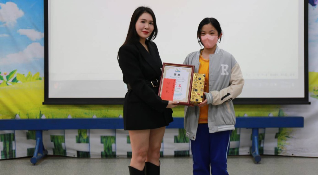 日喬恩生技有限公司負責人王喬儀(左)頒發第二名得獎學生。