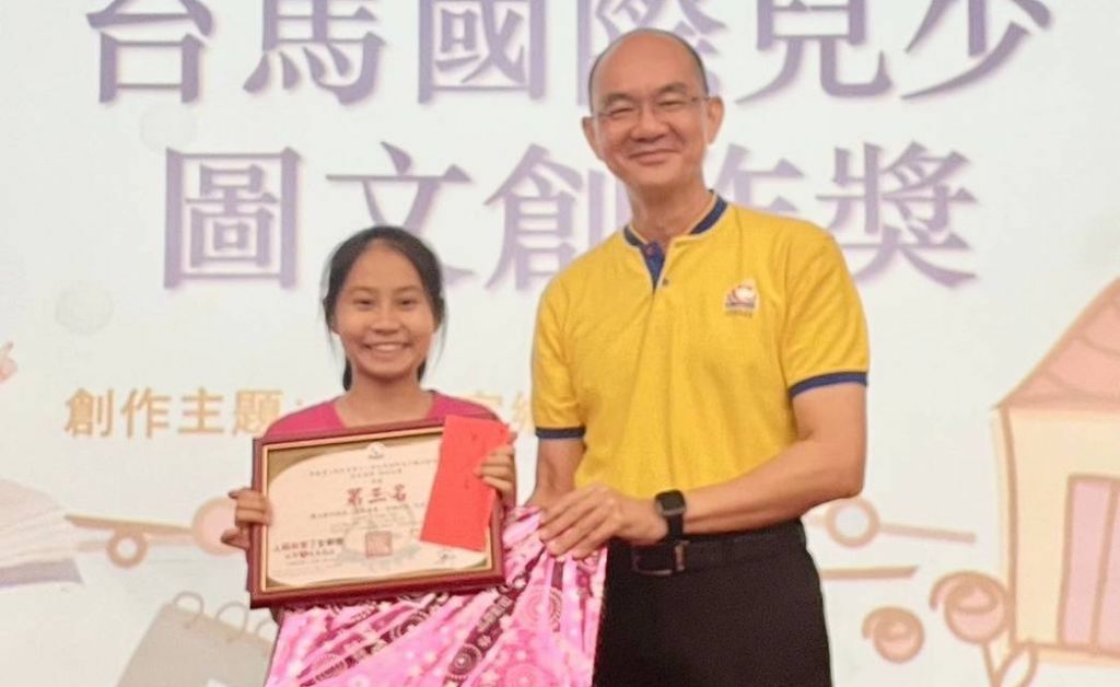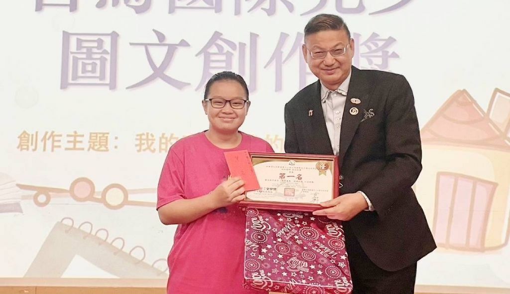 「第18屆人間有愛兒少文學」來自「日輝之家孤兒院」周欣如(左)獲得第一名獎項,由RIWAY38創始人林金瑩(右)頒獎。圖/協會提供