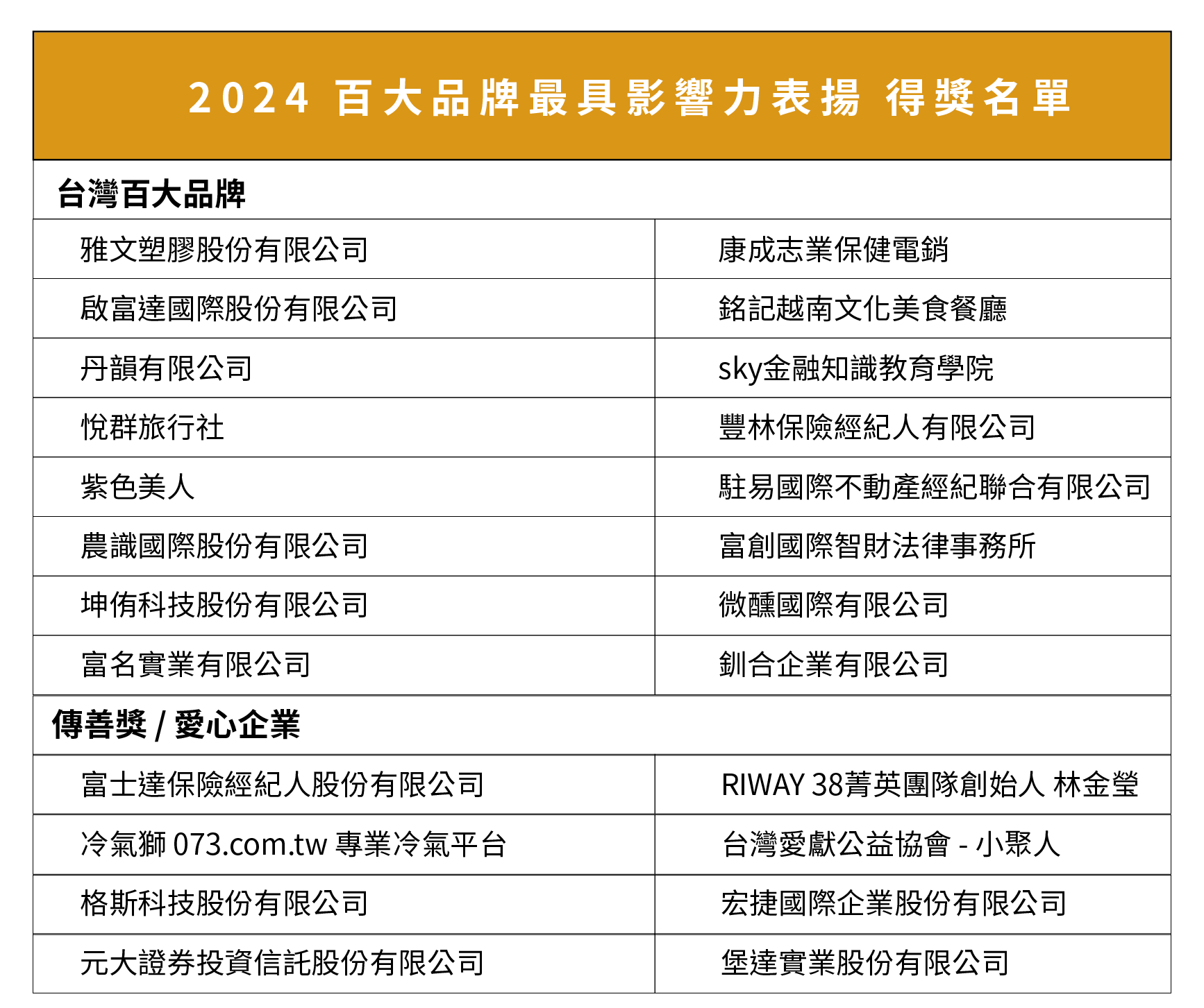 主辦單位林玉卿表示,「年度百大品牌最具影響力表揚」的宗旨在於透過品牌的故事,激發更多企業參與社會公益的熱情。品牌不僅是企業經營的象徵,更是影響社會的力量。我們希望透過這樣的平台,讓台灣優質品牌發揮更大的影響力,並以企業家的精神帶動社會共好。