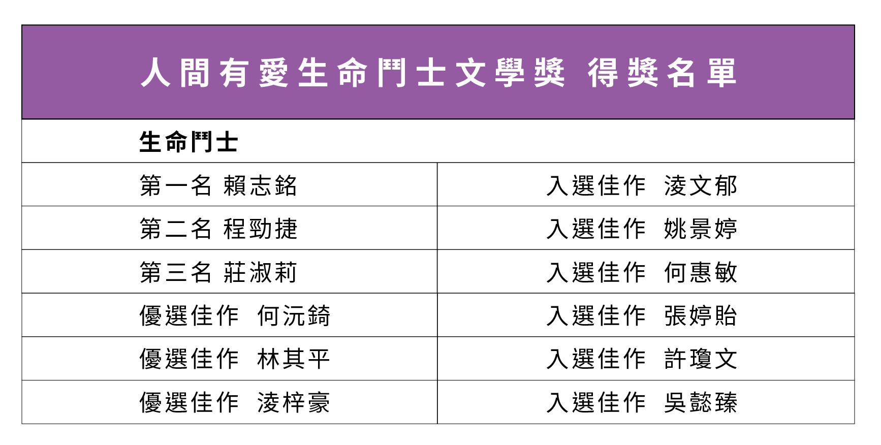 生命鬥士文學獎第一名賴志銘(左起),由富士達保險經紀董事長廖學茂頒發奬座,人間有愛理事長林玉卿回贈傳善獎。