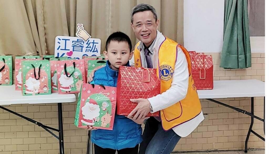 國際獅子會300A1區台北市榮成獅子會江睿紘會長(右)捐衣後與孩童合影。