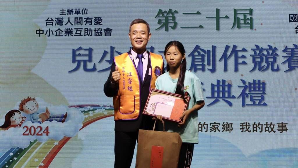 江睿紘會長頒發第一名兒少文學獎給得獎學生。