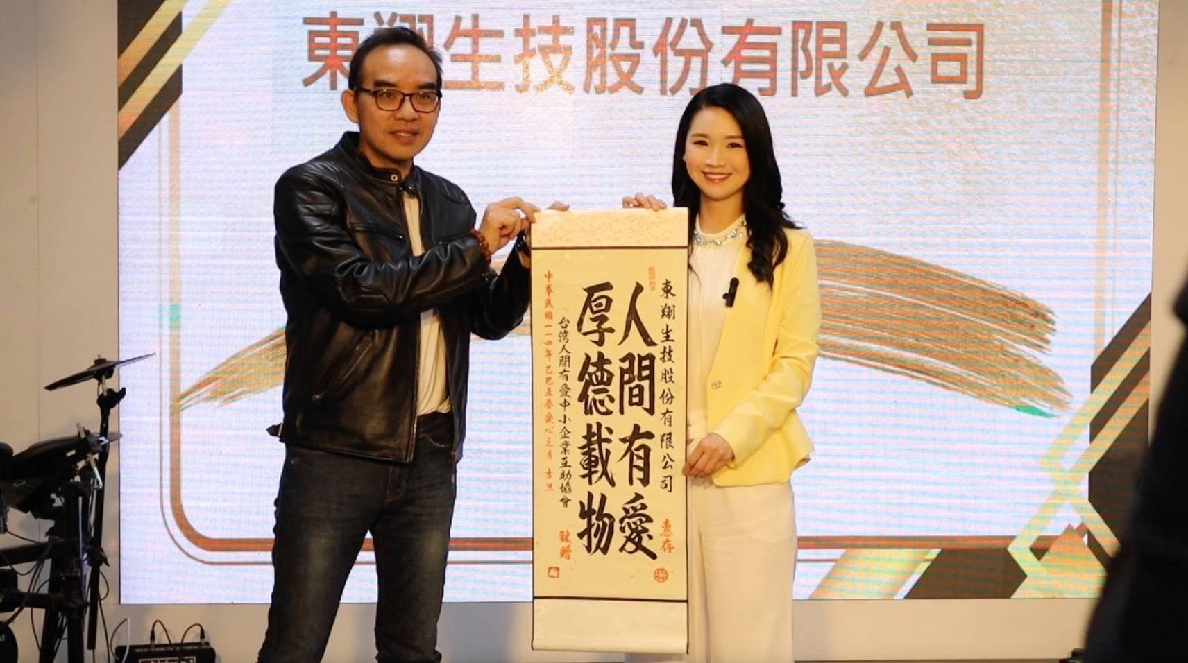 林玉卿理事長(右)頒贈字畫感謝第22屆協辦單位東翔生技。圖/協會提供