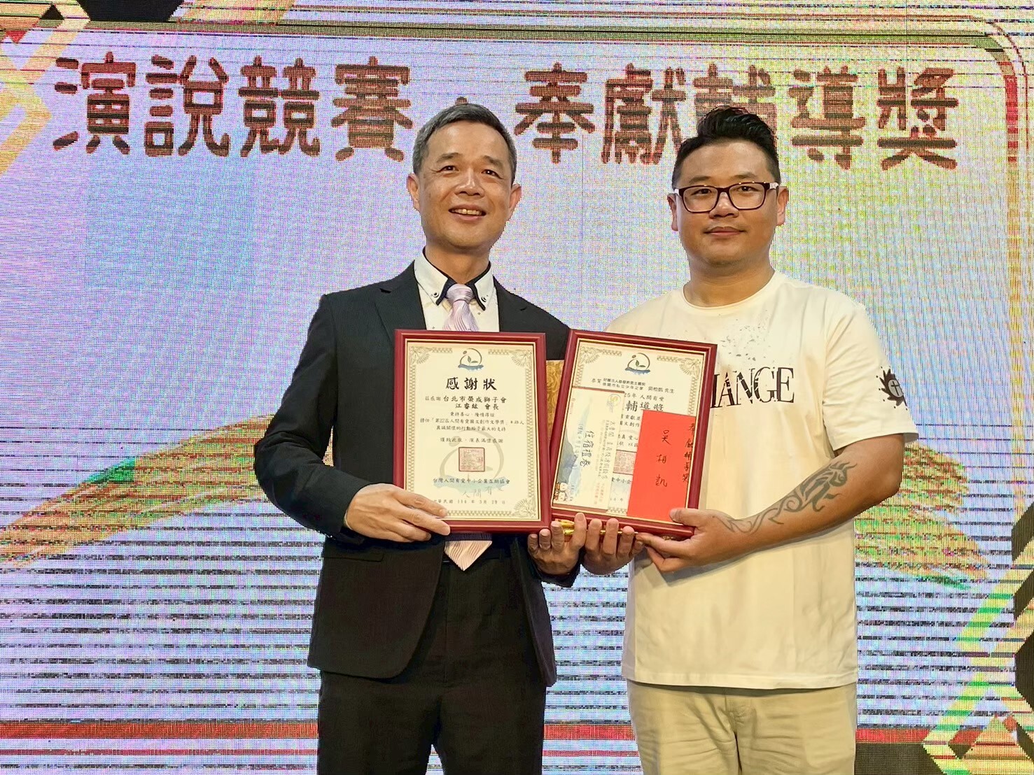 台北市榮成獅子會會長江睿紘(左)頒贈奉獻輔導獎予吳柏凱見證生命的傳承貢獻。圖/協會提供